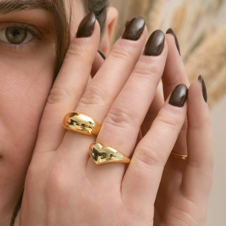 Nuestros anillos presentan un recubrimiento de baño de oro seguido de una capa de barniz, una combinación que asegura su durabilidad y evita el desgaste. Además, todos son ajustables para tu comodidad y amolde perfecto