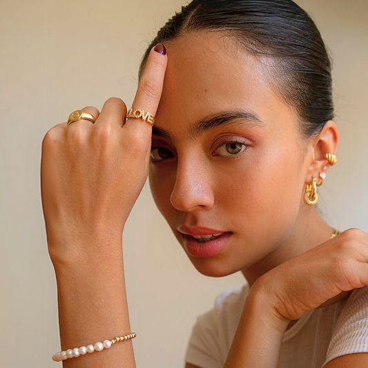 Nuestros anillos presentan un recubrimiento de baño de oro seguido de una capa de barniz, una combinación que asegura su durabilidad y evita el desgaste. Además, todos son ajustables para tu comodidad y amolde perfecto