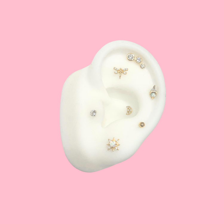 Nuestras deslumbrantes piezas de oro sólido de 14K han sido cuidadosamente diseñadas para tus perforaciones, con una parte trasera plana que se ajusta perfectamente a tu estilo de vida.