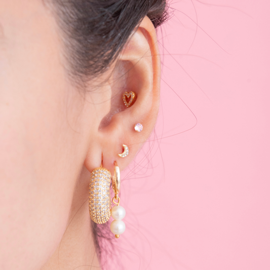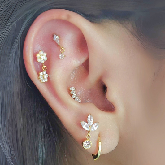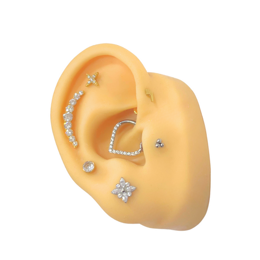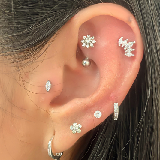 La parte trasera del piercing es plano por lo que es mucho más cómodo que un arete normal, se abrocha por enfrente. Contamos con diseños que se ajustan a la anatomía de tu oreja para estilizarla con modelos curvos para perforaciones en hélix, flat o conch.