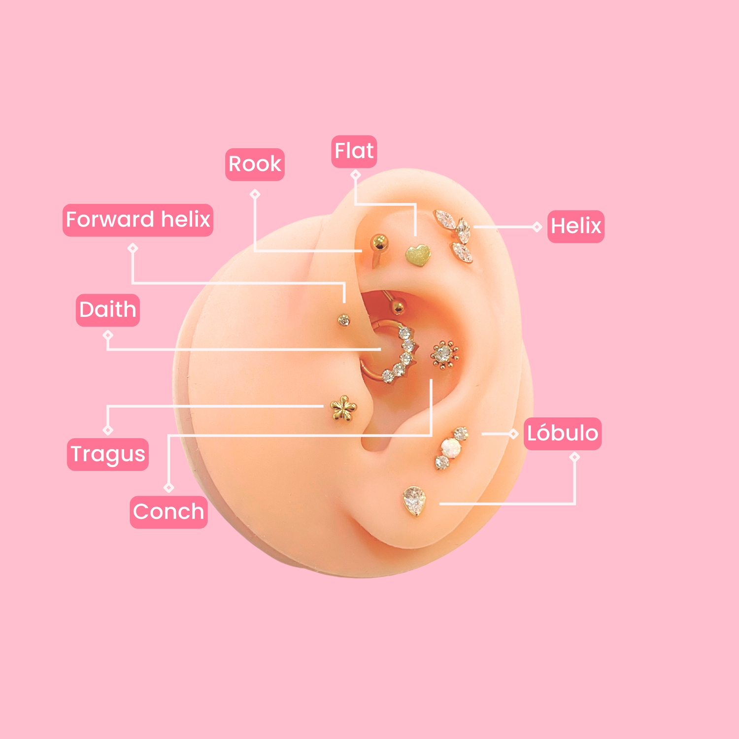 -Oreja: Lóbulo, Helix, Flat, Forward helix, Rook, Daith, Tragus y Conch.